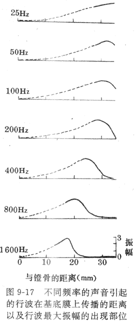 当声流振动通过听骨链到达卵圆窗膜时,压力变化立即传给隔离蜗内液体和膜性结构;如果卵圆窗膜内移,前庭膜和基底膜也将下移,最后是鼓阶的外淋巴压迫圆窗膜外移;相反,当卵圆窗膜外移时,整个耳蜗内结构又作反方向的移动,于是形成振动。可以看出,在正常气传导的过程中,圆窗膜实际起着缓冲耳蜗内压力变化的作用,是耳蜗内结构发生振动的必要条件。有人用直接观察的方法,详细记录了声音刺激引起的基底膜振动的情况,这对于了解基底膜振动的形式,以及这种振动在耳蜗接受不同频率的声音刺激时有何差异,提供了可靠的依据。观察表明,基底膜的振动是以行波(traveling wave)的方式进行的,即内淋巴的振动首先是靠近卵圆窗处引起基底膜的振动,此波动再以行波的形式沿基底膜向耳蜗的顶部方向传播,就像人在抖动一条绸带时,有行波沿绸带向远端传播一样。下一步还证明,不同频率的声音引起的行波都从基底膜的底部,即靠近卵圆窗膜处开始,但频率不同时,行波传播的远近和最大行波的出现部位有气温同,如图9-17所示,;这就是振动频率愈低,行波传播愈远,最大行波振幅出现的部位愈靠近基底膜顶部,而且在行波最大振幅出现后,行波很快消失,不再传播;相反地,高频率声音引起的基底膜振动,只局限于卵圆窗附近。