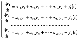 称为常系数线性微分方程组,式中aij是常数.fi(t)0 (i=1,2,,n),称(3)为齐次的,当fi(t)不全恒等于零,称(3)为非齐次的.
