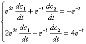 其次,利用常数变易法求非齐次线性方程组(1)的一个特解.c1 ,c2看成是t的函数,解下列方程组