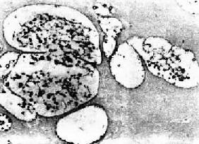切片示脑组织内形成许多小囊腔,腔内充满隐球菌及其所分泌的凝胶样物质
