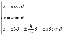 [圆柱螺旋线] 一动点绕一直线作等速转动,并沿这直线作等速移动,则称这个动点的轨迹为圆柱螺旋线(图7.19),其参数方程为