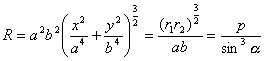 式中r1, r2为焦点半径,p为焦点参数,a为点M(x, y)的焦点半径与切线的夹角,特别,顶点A, B的曲率半径