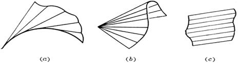 The limit position of the intersection of two adjacent planes in the ridge plane family is called the feature line of the family, and the envelope of the feature line (if it exists) is called the ridge line of the family, which divides the envelope surface into two leaves, with the ridge Lines as "sharp bobbins" of surfaces (figure ( d ) )