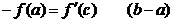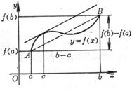 [ Mean Value Theorem ]   If (i) f ( x ) is defined on the closed interval [ a , b ] and is continuous, and (ii) there is a finite derivative in the open interval ( a , b ) , then between a and b There is at least one point c between them , which satisfies the equation