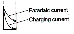 The current is sampled near the end of the pulse when the Faradaic current (due to the reduction of Cu2+) is large compared to the charging current (due to the migration of the electroinactive supporting electrolyte ions in response to the charging of the electrode) – ie., the signal-to-noise ratio is largest.