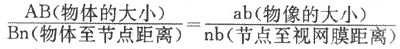 利用简化眼可以方便地计算出不远近的物体在视网膜上成像的大小。如图9-4所示,AnB和and是具有对顶角的两个相似的三角形,因而有: