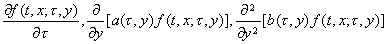[柯尔莫哥洛夫第二方程] 如果扩散过程的条件分布函数F(t,x;τ,y)具有分布密度f(t,x;τ,y),并且下面的各个偏导数