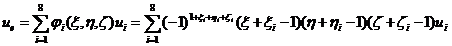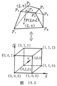 [ Three-way distance coordinates ] Let the vertices of the hexahedron be ( i = 1, 2, … , 8 ) ( Figure 19.5 ) . Using bidirectional distance coordinates , first transform the quadrilateral to a unit square ( 0 ≤ ξ ≤ 1 , 0 ≤ η ≤ 1 ) on the coordinate plane ζ = 0 of the local coordinate system ( ξ , η , ζ ) ; then define the distance on the line segment coordinates , and take it as (1- ζ , ζ ), where ζ is 0 and 1 respectively![]()